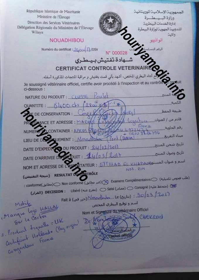 افادت مصادر موثوقة لحرية ميديا ، عن إيقاف حاوية مجهولة المصدر في انواذيبو، حيث تم احتجازها لعدم وضوح مستنداتها و عدم وجود شهادة حلال على اكياس الدواجن التي بالحلويات. و تفيد المصادر ان الشركة الموردة اتصلت بالوزارة التي ترددت قبل ان تتخذ قرارا بإدخالها.