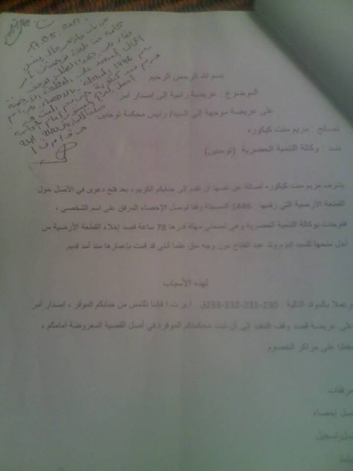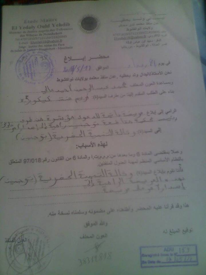 حصلت حرية ميديا على وثائق تثبت تلاعب وكالة التنمية الحضرية " لادي" بوثائق رسمية وجهتها محكمة رسمية في نواكشوط الى الوكالة المذكورة بغية فتح دعوى من طرف السيدة مريم منت كيكوره في القطعة الارضية رقم 1446 المسجلة وفقا لوصل الاحصاء ، وقد سلم الشكاية عدل منفذ انظر الوثيقة الثانية ، حيث رفضت وكالة التنمية الحضرية التعامل مع الجهاز القضائي الذي يعتبر المنفذ الوحيد لانصاف المظلومين ، السؤال المطروح ، هل تعمل وكالة التنمية الحضرية فوق النظم والقوانين المعمول بها في البلد .