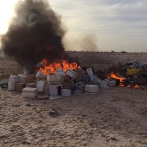 في إطار النجاحات المتتالية التي يحققها قطاع الجمارك تمكنت فرق جمارك مطار انواكشوط الدولي من حجز كميات كبيرة من الخمور و المخدرات والأدوية المزورة والمواد الكحولية بالغة التأثير ،و بقيمة مالية معتبرة تزيد على 16 طن ،وقد أشرف على عملية حرق هذه الخمور رئيس مكتب جمارك مطار أنواكشوط سيد محمد ولد محمد و حاكم مقاطعة تفرغ زينه و وكيل الجمهورية ومفوض مكافحة المخدرات وممثل عن وزارة البيئة و المفتش محمد صو والمفتش مولاي أحمد ولد جمال ولد الدولة وممثل عن الدرك وعناصر من جمارك المطار وممثلين من الصحافة الرسمية والمستقلة ، رئيس مكتب جمارك المطار تحدث بالمناسبة وقال بأن العملية كفيلة بأن تعطي درسا واضحا لمن كانوا يفكرون بعمليات مماثلة أن الجمارك سيكون لهم بالمرصاد وأن محاولات التهريب في ظل يقظة هذا القطاع ستكون نوعا من الإنتحار لأصحابها.