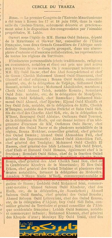 حرية ميديا : كشفت جريدة فرنسية ان هذا الاجتماع الذي عقد يومي 17 و 18 يونيو 1950 بمدينة لكوارب او روصو. كان قد حضره جمع غفير جدا من الزعماء التقليديين انذاك لجميع الولايات الموريتانية ، من بينهم:
