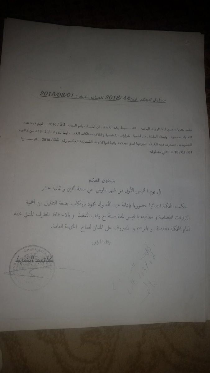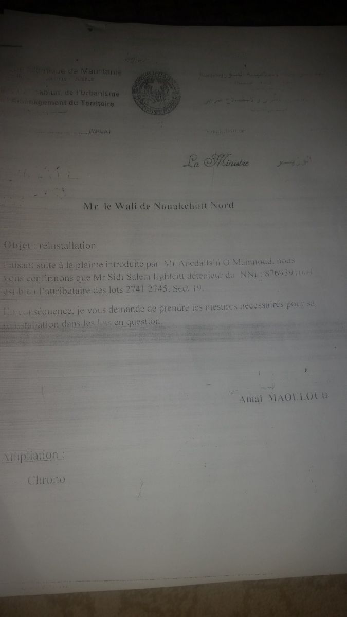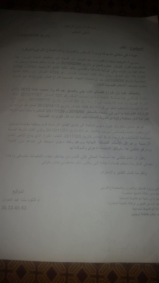 حرية ميديا : وزيرة الإسكان والعمران والاستصلاح الترابي ترفض قرارات المحاكم وتعتمد شهادة رجل طرف وسبق ان حكم عليه تلات مرات بسب العصيان المدني لتحول ملكية الأرض المتنازع عليها للطرف الاخر وذلك بالاعتماد علي شهادة مزورة تحمل إشارة عدم منح الملكية. تعود الحكاية في الأصل الي بداية العام 2010 والذي حكمت فيه المحكمة لصالحي علي المدعو عبدالله ولد محمود بموجب الحكم الصادر بتاريخ 21/11/2012 رقم 121 لتعود الغرفة المدنية بمحكمة الاستئناف لتأكيده في قرارها رقم 54 بتاريخ 15/05/2013 والذي أكدته المحكمة ممثلة بالغرفة المدنية بالمحكمة العليا في قرارها رقم 104 الصادر بتاريخ 13/04/ ليمعن في تحدي القرارات القضائية ما أدي الي متابعته بالمساطر 60/2015 و 129/2017 المنشورة حاليا امام الغرفة الجزائية لدي محكمة ولاية نواكشوط الشمالية لعدم احترامه لكل القرارات القضائية هذا ورغم الاحكام الواضحة فان الوزيرة وجهت رسالة اعتمدها والي وحاكم ولاية ا نواكشوط الشمالية لهدم الممتلكات والبنايات المشيدة في القطع الأرضية المتنازع عليها وسمحت للطرف المغلوب حسب الاحكام الصادرة حتى الان بالتصرف في القطع الأرضية. هذه القضية تضع على الواجهة ضرورة فصل السلط وجعلها حقيقة يستفيد منها الجميع وتضمن العدل والامن والسلم الاجتماعي و المساوات.