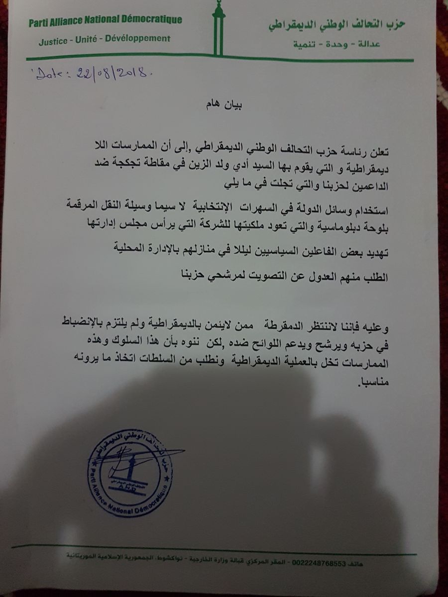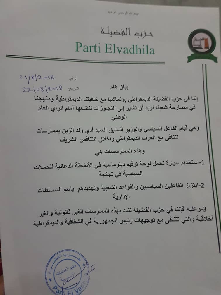 واتهم الحزبان المذكوران الوزير السابق ولد الزين باستخدام سيارة بلوحة دبلوماسية في النشاط السياسي وابتزاز المواطنين بالادارة المحلية. وفيما يلي نص البيانين: