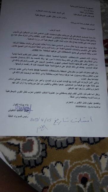 حرية ميديا : أعلن رئيس قسم تكتل القوى الديمقراطية ، في مقاطعة وادالناقة السيد بداه ولد بونه ولد الكوار ، انسحابه من حزب تكتل القوى الديمقراطية ، وقال بداه في رسالة استقالته قررنا وبكامل قناعتنا الانضمام لصفوص الحزب ، الذي رمناُ من خلاله ولوج الممارسة السياسية لكننى للأسف لم نتمكن من البقاء مع قوم لا يعتبرون وجودنا مكسبا ، ويضيف اليوم كل شيء إذا بلغ الحد أنتهى ، ولايدوم إلى وجه الله الكريم.