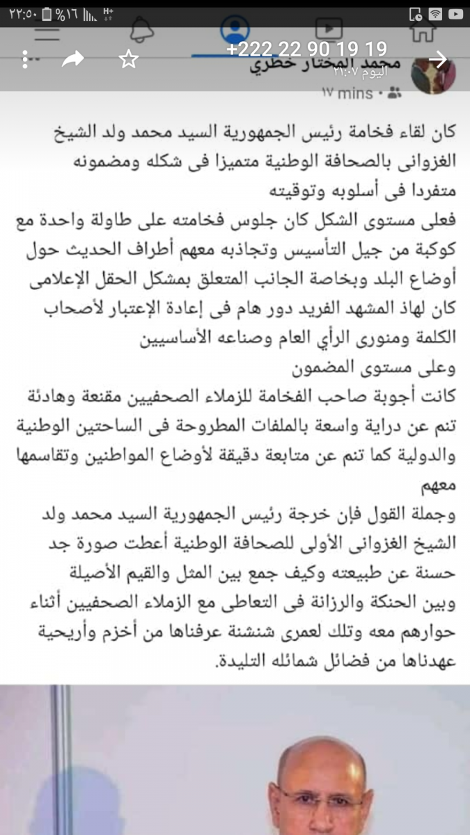 كتب مدير قناة المحظرة التابعة لباقة قناة الموريتانية ،الاعلامي محمد المخار ولد خطري ، تدوينة على صفحته على الفيس بوك أشاد فيها باللقاء الذي أجراه رئيس الجمهورية محمد ولد الشيخ الغزواني ، الليلة البارحة مع الصحافة .